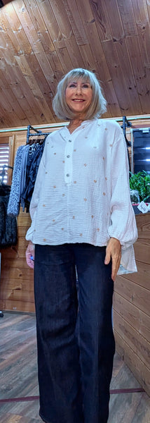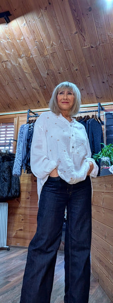 Cassia blouse is an ageless casual blouse made for everyday style. Made from crisp white cotton, this oversized blouse features gold embroidered flowers.