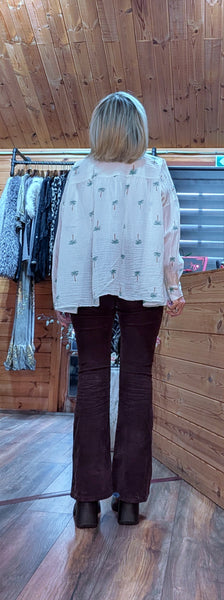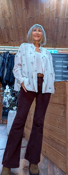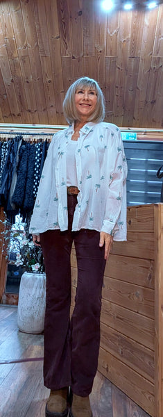 Update your wardrobe with our Daryl Cotton Blouse, a white oversized casual blouse featuring green embroidered palm trees.Collared and relaxed fit, it’s perfect for casual everyday style.