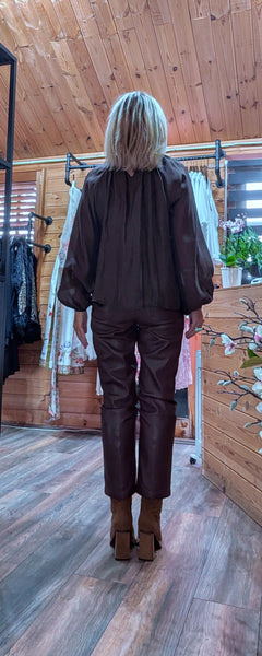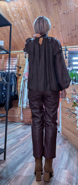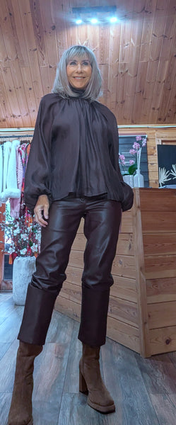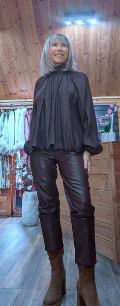 Meet Joanna – the chic blouse every wardrobe needs. In a rich chocolate shade, this elegant long-sleeve blouse is designed with a high neck, soft draping, and feminine balloon sleeves. Finished with two delicate buttons at the nape, Joanna is full of sophistication.