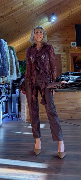 Step into chic evening style with Vivienne – a stunning chocolate lace blouse elevated with satin-feel ruffled frills along the collar, cuffs, and front. With flared long sleeves and cascading frill detail, this blouse strikes the perfect balance of dramatic and elegant. And has a little hint of sparkle!