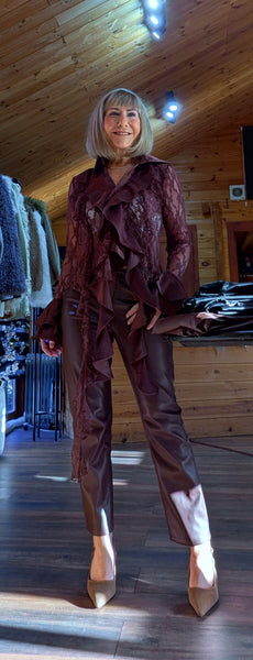 Chocolate lace blouse with satin-feel ruffled frills