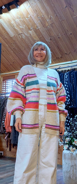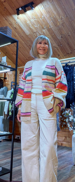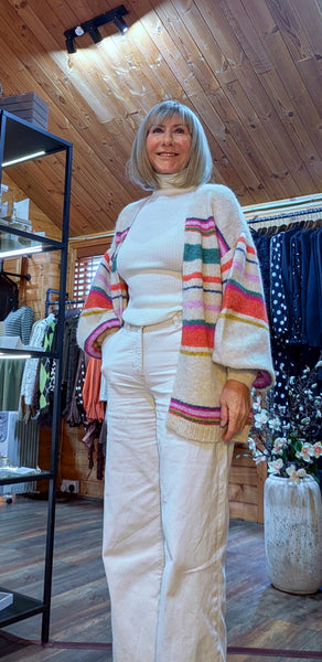 This super soft cardigan in a dreamy cream is elevated with bold multicoloured stripes, open front without buttons, and balloon sleeves. Valerie is the perfect cardi for this winter heading into spring