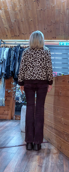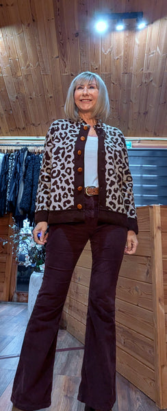 Say hello to Irene – a bold, beautiful, ultra-soft leopard print cardigan designed to bring a statement chic to your wardrobe. Features contrast front paneling and statement rounded buttons.