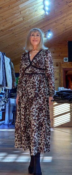 Step into effortless glamour with Caterina – a showstopping leopard print dress that blends wild charm with refined elegance. Featuring a flattering V-neckline trimmed with delicate lace and shimmering gold accents woven throughout, this dress adds a sophisticated sparkle to your look.