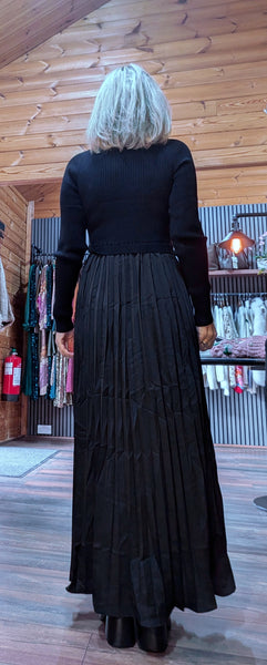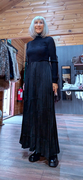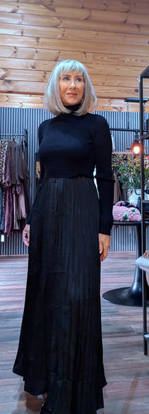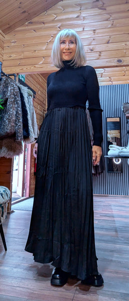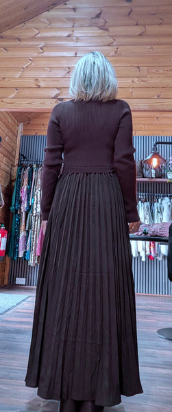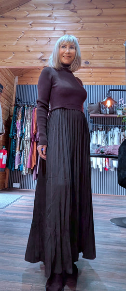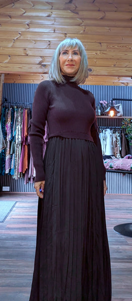 Introducing Haley – a gorgeous sweater-style dress that perfectly blends style with sophistication. Featuring a chic high neck knit top and a flowing pleated maxi skirt, in a coffee colour, Haley is designed in a viscose and polyester.