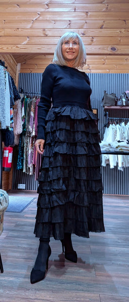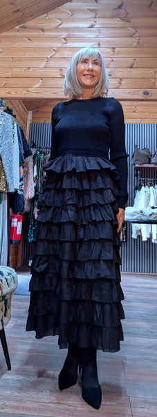 Step out in style with Imogen – a stunning black tulle dress that perfectly blends Sass with showstopping elegance. Featuring a soft long-sleeved knit top and a beautifully layered tulle skirt, this dress moves effortlessly from day to night.
