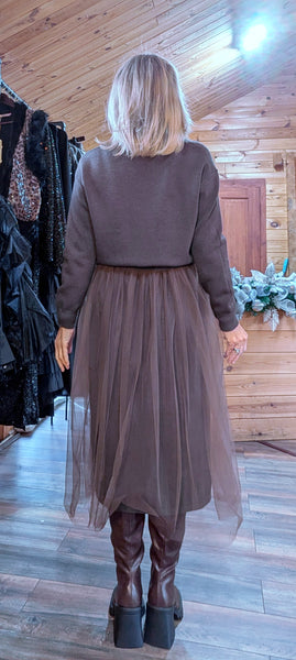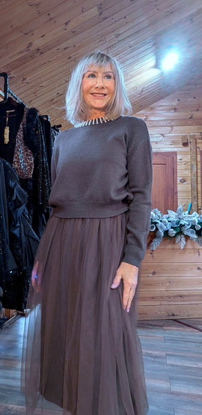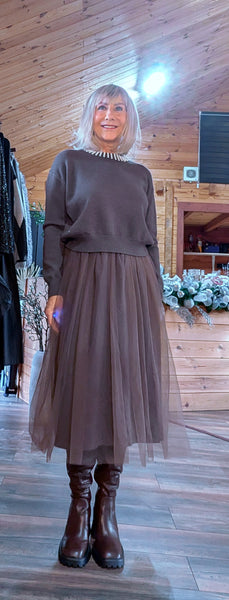 Step into elegance this season with Maud – a stunning Italian two-piece set that’s utterly effortlessly chic. The set features a beautifully soft high-neck sweater adorned with delicate pearl button trim, paired with a floaty tulle dress featuring a soft vest top and full layered skirt.