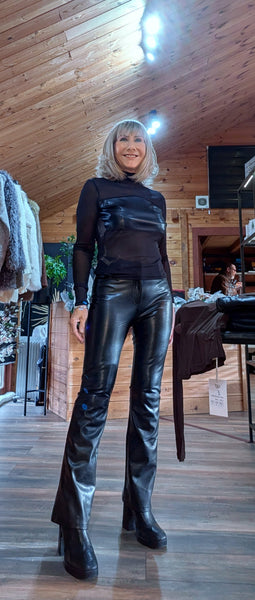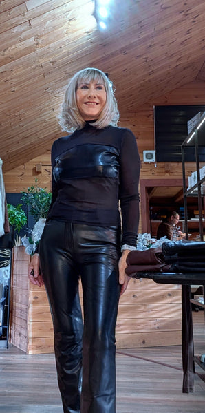 Meet Marla – effortlessly chic with a touch of edge. This stunning sheer fitted top features a sleek faux leather panel across the bust, creating a striking contrast against its soft, sheer sleeves and high neckline.