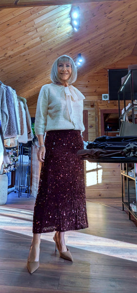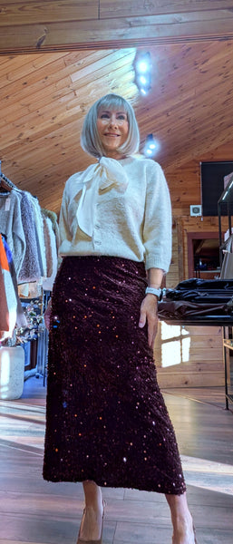 Bring a touch of glamour to your wardrobe with Astrid – a stunning chocolate brown or chic black sequin bias cut skirt designed to shimmer with every step. Featuring an elegant elasticated silk waistband,  Astrid is also fully lined .