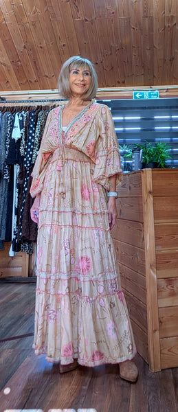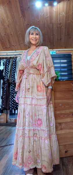With intricate sequins & beading detail around the neckline, with tassel ties, fully lined & the amazing shirred waist clincher , in a dreamy caramel with blush & pink floral pattern.