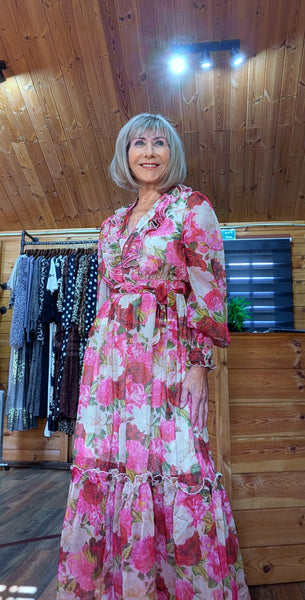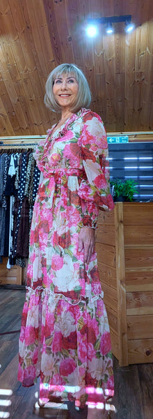 Luna Floral Crepe Maxi Dress in Pink- Green with Frill V-Neck