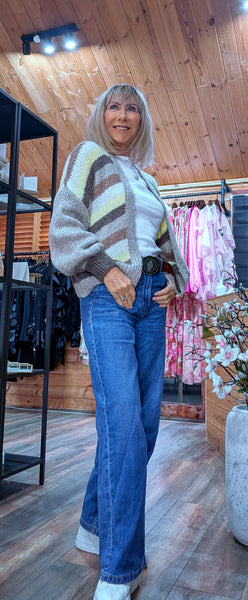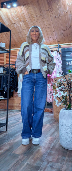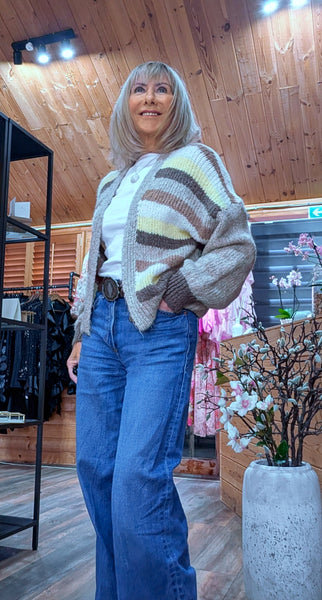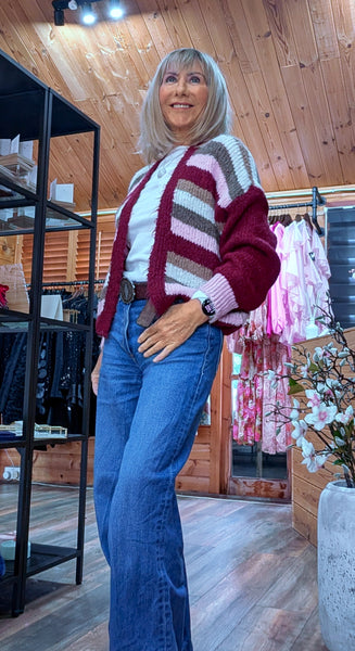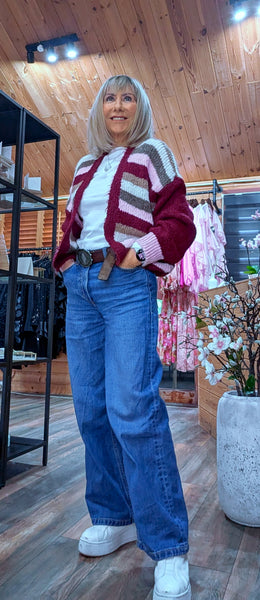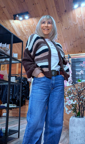 Get cosy in Abby – a beautifully soft chunky cardigan designed for effortless layering. With long sleeves and bold multi-coloured stripes, Abby comes in three gorgeous shades: chocolate, ecru, or burgundy.