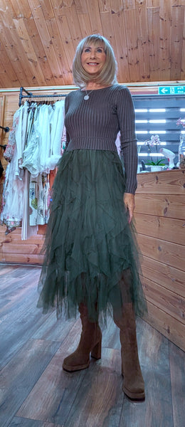 Our Anastasia Tulle Dress is the ultimate blend of elegance and glamour. Featuring a stunning waterfall-style tulle skirt, this dress offers a fabulous flowing style that's perfect for any special occasion. The scoop neck sweater top, attached to the tulle skirt, adds a chic vibe. Fully lined, this dress is made from a luxurious blend of viscose (50%), polyamide (25%), and modal (25%) that drapes beautifully.