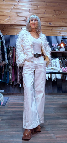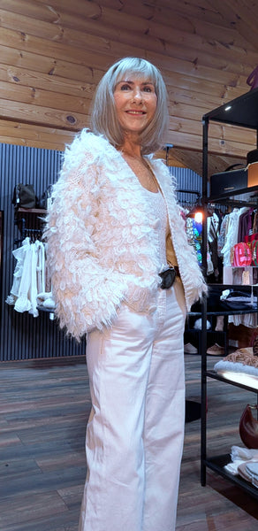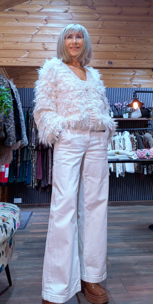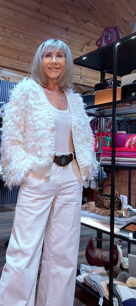 Introducing Aviary – a stunning ivory cardigan that’s soft, sassy, and oh-so-chic. With its super chunky knit, V-neckline, and statement fringe loops, this cardi is perfect for your autumn/winter wardrobe.