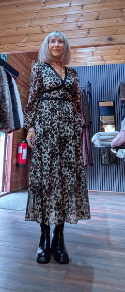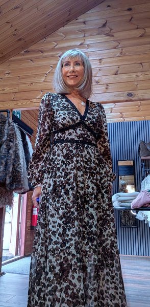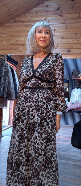 Step into effortless glamour with Caterina – a showstopping leopard print dress that blends wild charm with refined elegance. Featuring a flattering V-neckline trimmed with delicate lace and shimmering gold accents woven throughout, this dress adds a sophisticated sparkle to your look.