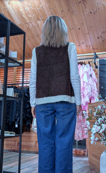 Layer up in style with Colleen – a cute sleeveless cardigan in a warm cocoa shade, finished with a striking ivory contrast border. Adorable little gold love buttons and practical front pockets , making it the perfect piece for chic autumn/winter layering.
