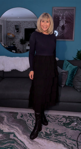 Elevate your style with our stunning Geraldine Midi Dress, featuring a gorgeous sweater top paired with a chic chiffon-frilled tiered skirt in sophisticated navy blue. Fully lined and complete with elegant long sleeves, this dress is perfect for brunching ladies.