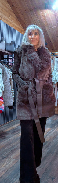 Wrap yourself in luxury with Faith – a stunning faux fur sleeveless jacket in a dreamy chocolate hue. Designed with a statement collar, front pockets, and a chic faux leather tie belt to cinch the waist, Faith is as flattering as it is stylish.