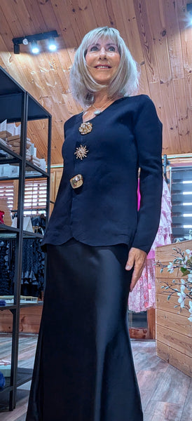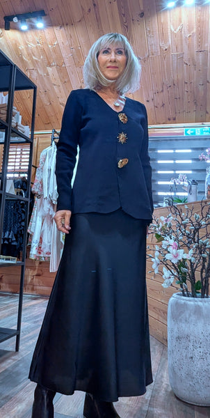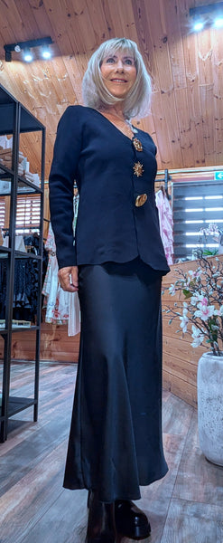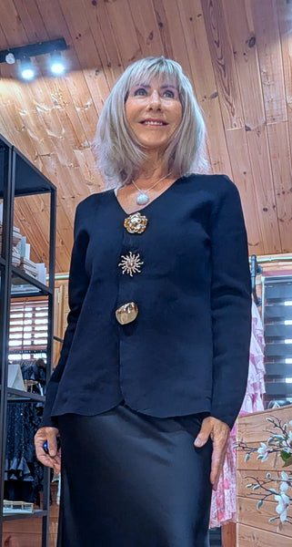 Step into chicness with Gayle – a sleek, tailored cardigan that’s perfect for elevating your autumn/winter wardrobe. Available in classic black, Gayle features a flattering V-neckline and is finished with stunning gold brooch-style jewel buttons that bring a touch of evening glamour.