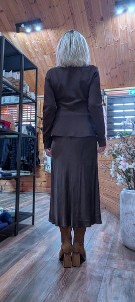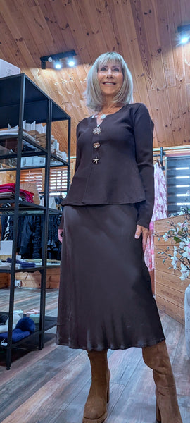 Step into chicness with Gretchen – a sleek, tailored cardigan that’s perfect for elevating your autumn/winter wardrobe. Available in rich chocolate, Gretchen features a flattering V-neckline and is finished with stunning gold brooch-style jewel buttons that bring a touch of evening glamour.