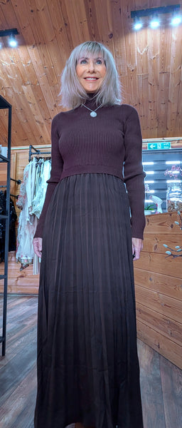 Introducing Haley – a gorgeous sweater-style dress that perfectly blends style with sophistication. Featuring a chic high neck knit top and a flowing pleated maxi skirt, in a coffee colour, Haley is designed in a viscose and polyester.