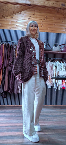 In a Chic Chocolate chunky knit, Honor is finished with a stunning sequin border that makes every outfit standout! The boho-inspired design is completed with beautiful Pagoda sleeves, giving it that effortlessly stylish touch you’ll love to throw on all of the party season.