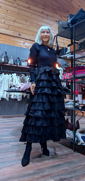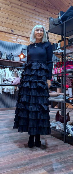 Step out in style with Imogen – a stunning black tulle dress that perfectly blends Sass with showstopping elegance. Featuring a soft long-sleeved knit top and a beautifully layered tulle skirt, this dress moves effortlessly from day to night.