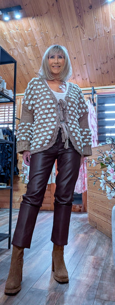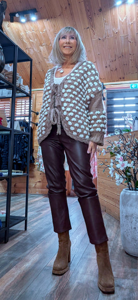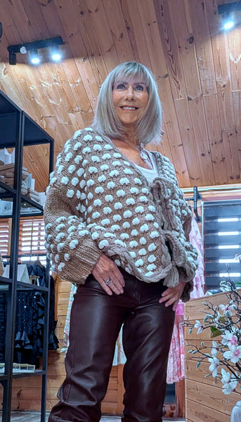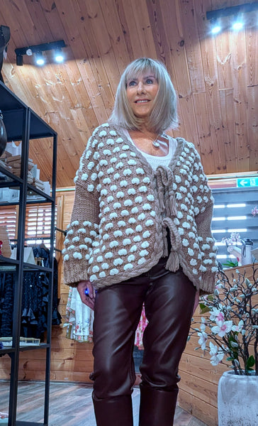 Say hello to Lara – a super chunky oversized cardigan with serious boho vibes. Designed with balloon sleeves and double front ties, Lara comes in a warm caramel shade, beautifully accented with white embroidered bobbles.
