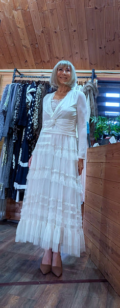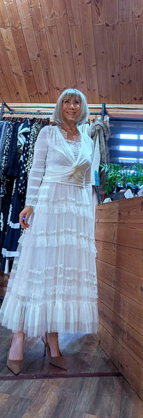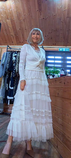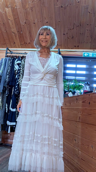 Meet Lourdes – a stunning ripple-effect tulle skirt in ivory that’s perfect for the new season. With its soft, flowy layers this skirt is romantic and chic all in one!