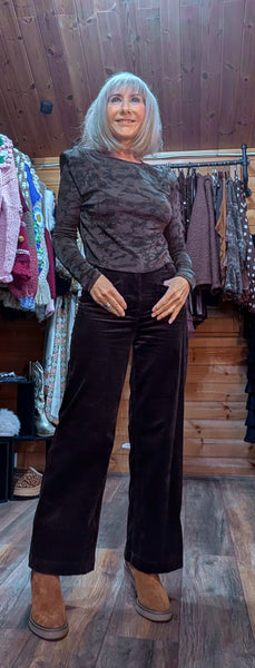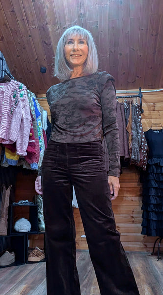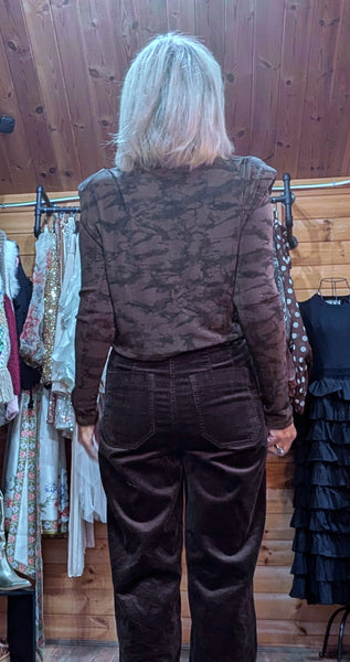 Meet Madeline – the perfect mix of style and sophistication. This warm chocolate lurex look top features a subtle tie-dye look, long sleeves, and soft shoulder pads for that extra bit of sass!
