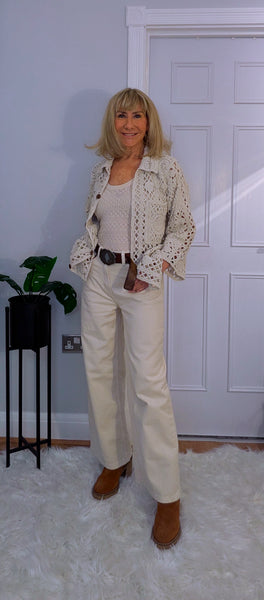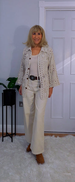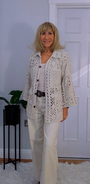 Add a touch of timeless charm to your wardrobe with our Magna Cardigan—a beautifully crafted beige crochet cardigan that’s equal parts cute and chic. Made from 100% cotton, Magna features collars, front pockets, and 3/4 length sleeves for easy layering .