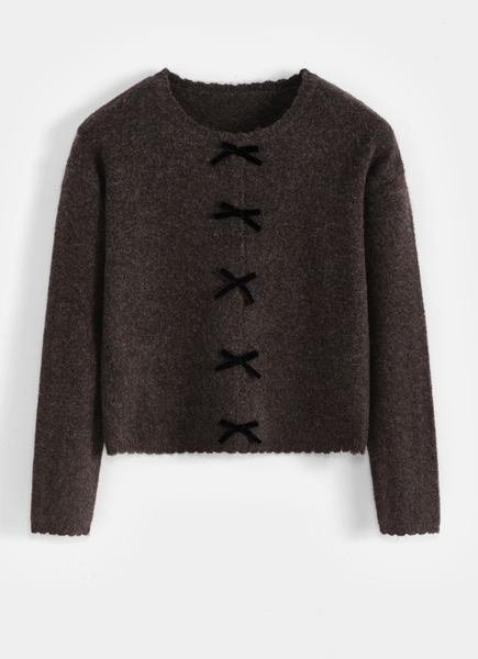 Our Maple Taupe Sweater is a must have addition to your wardrobe this season. Designed to give the impression of a cardigan, it features adorable little bows up the front and a delicate frill pattern along all edges, including cuffs.