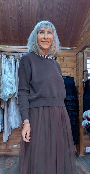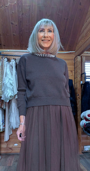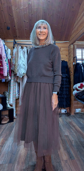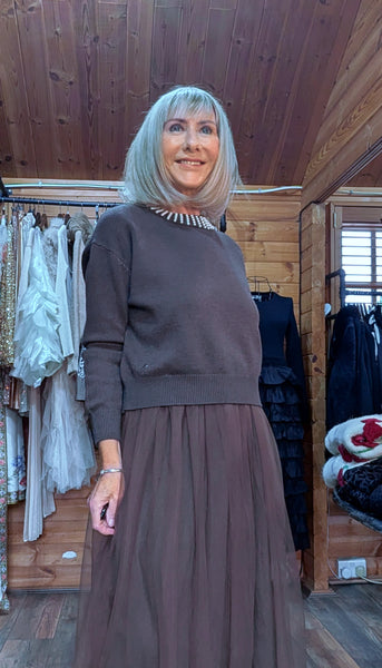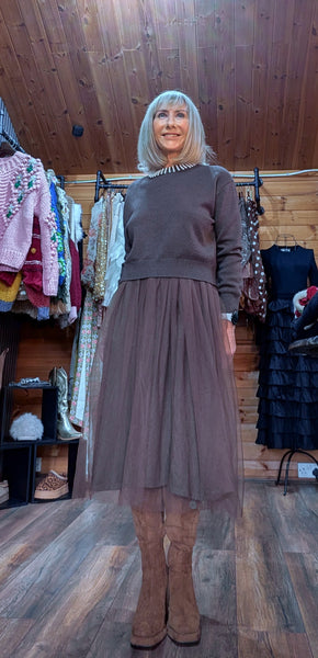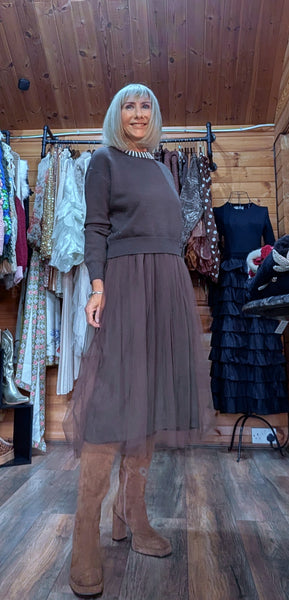 Step into elegance this season with Maud – a stunning Italian two-piece set that’s utterly effortlessly chic. The set features a beautifully soft high-neck sweater adorned with delicate pearl button trim, paired with a floaty tulle dress featuring a soft vest top and full layered skirt.