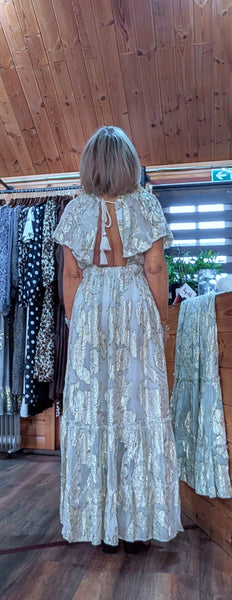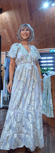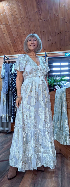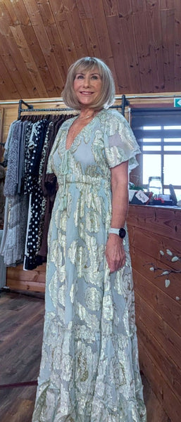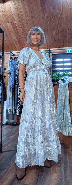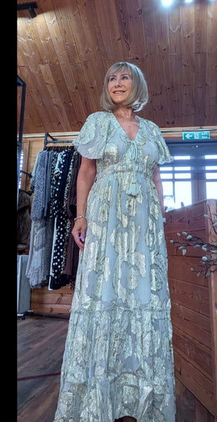Gold rose embossed maxi dress in Sage Green or Soft Beige