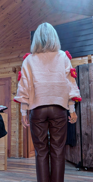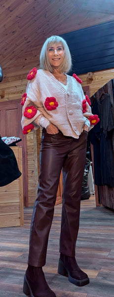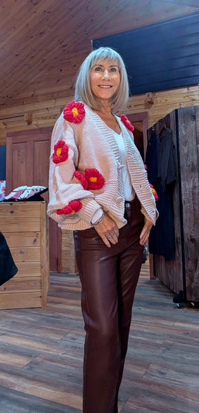 Add a little fun and flair to your wardrobe with Mimi – a gorgeous beige chunky knit cardigan adorned with striking 3D red flowers. Playful yet stylish, this statement piece brings a pop of colour and texture to your autumn/winter looks.