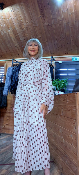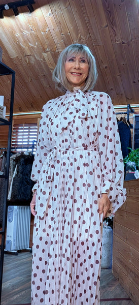 Featuring a high neck with ties, long sleeves, and delicate pleated skirt, this dress is feminine, floaty, while the classic polka dot pattern adds a timeless feel, it also comes with a cami style slip.