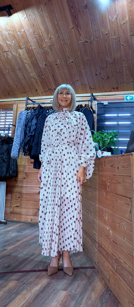 Step into effortless style this season with our Natalya ivory polka dot pleated dress — a beautifully feminine midi designed for easy stylish dressing.