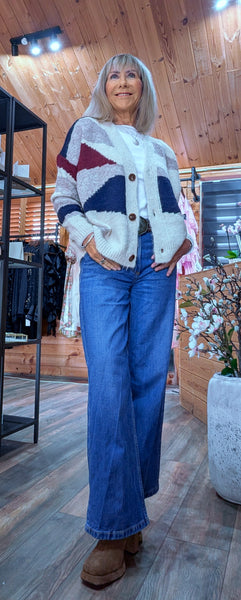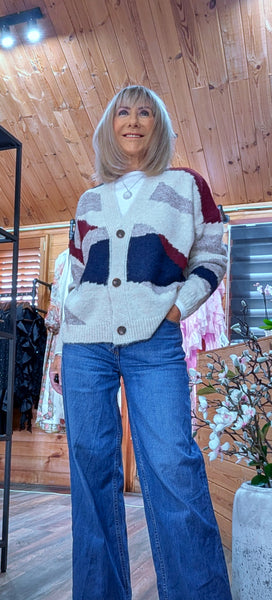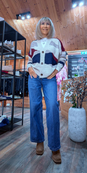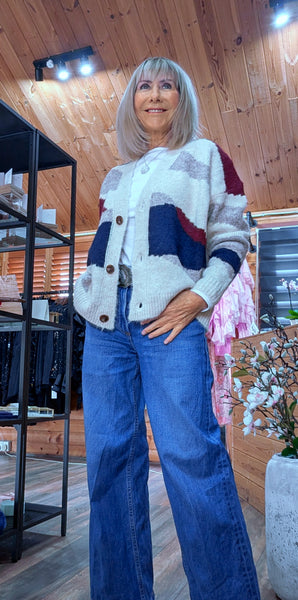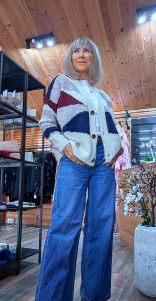 Brighten up your autumn wardrobe with Petula – a soft knit cardigan in a stunning mix of warm seasonal colours. Featuring a block print design in burgundy Navy and a warm beige. Petula is the perfect layering piece to keep cosy while looking effortlessly chic.