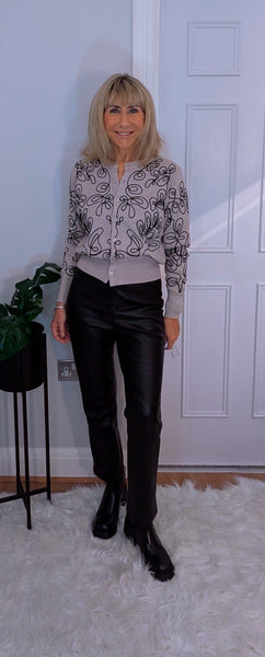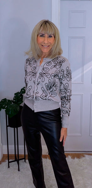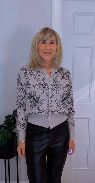 A stunning little cardigan in taupe with black embroidery floral detail.