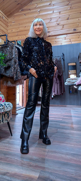 Sparkle your way into the season with Shania – a stunning black sequin blouse that’s made for the spotlight. With a button-up front, silky satin-feel collar and cuffs, and a fully lined body, Shania just oozes glam.